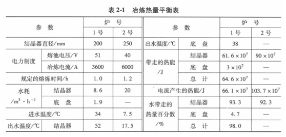 表2-1为结晶器中熔炼至一定高度的钢锭热传递的热量平衡表。这些数据证明渣池中电流析出的绝大部分热量(②、③、⑦项)被结晶器的冷却水带走。
