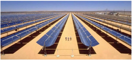 (1)槽式线聚焦系统:采用长槽型抛物柱面聚焦系统,将若干倍轴向两侧面积上的太阳辐射能,聚焦在系统焦线上的小范围,形成高能量密度的太阳辐射能,用于加热焦线管道中的导热油或融熔盐载热工质;再将获得高温的工质,输送往蒸汽发生器加热软水,从而获取过热蒸汽;最后利用过热蒸汽推动汽轮发电机组发电。槽型抛物柱面聚焦系统按东西方向布阵安装,只需跟踪南北一个方向上每月8°左右的太阳位移,就可达到聚焦加热工质的目的。但因为该型系统的几何聚光比不是很高,焦线加热温度一般只在260°C ~ 570°C之间,而且工质输送路线太长,高温工质的热损较大,故热发电效率不是很高。