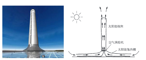 图6. 13太阳能热烟囱发电(照片及原理示意图