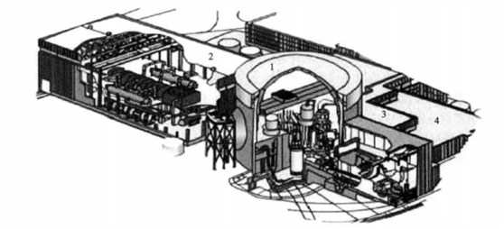 图1-2压水堆核电厂主要厂房 1 一安全壳;2-汽轮发动机厂房;3-燃料操作厂房;4一辅助设备厂房核岛由以下几部分组成: