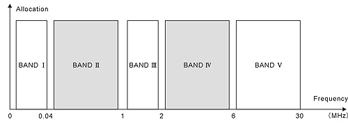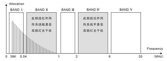 国际标准IEC 61603-1推荐了可用于音频信号传输的红外辐射 调制频段BAND Ⅱ(45kHz-1 MHz)和BAND IV (2MHz—6MHz)。其中BANDⅡ (45kHz-1MHz)主要用于会议用音频传输系统及类似系统:BAND IV (2MHz-6MHz)主要用于宽带音频及相关信号传输系统。